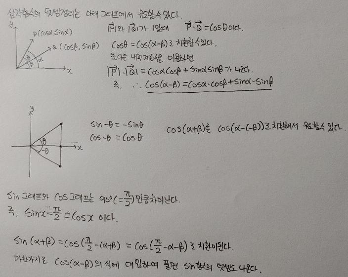 단위원에서의 sin, cos 함수의 특징으로 삼각함수의 덧셈정리를 유도하고 그를 이용하여 행렬을 만들어낸다.