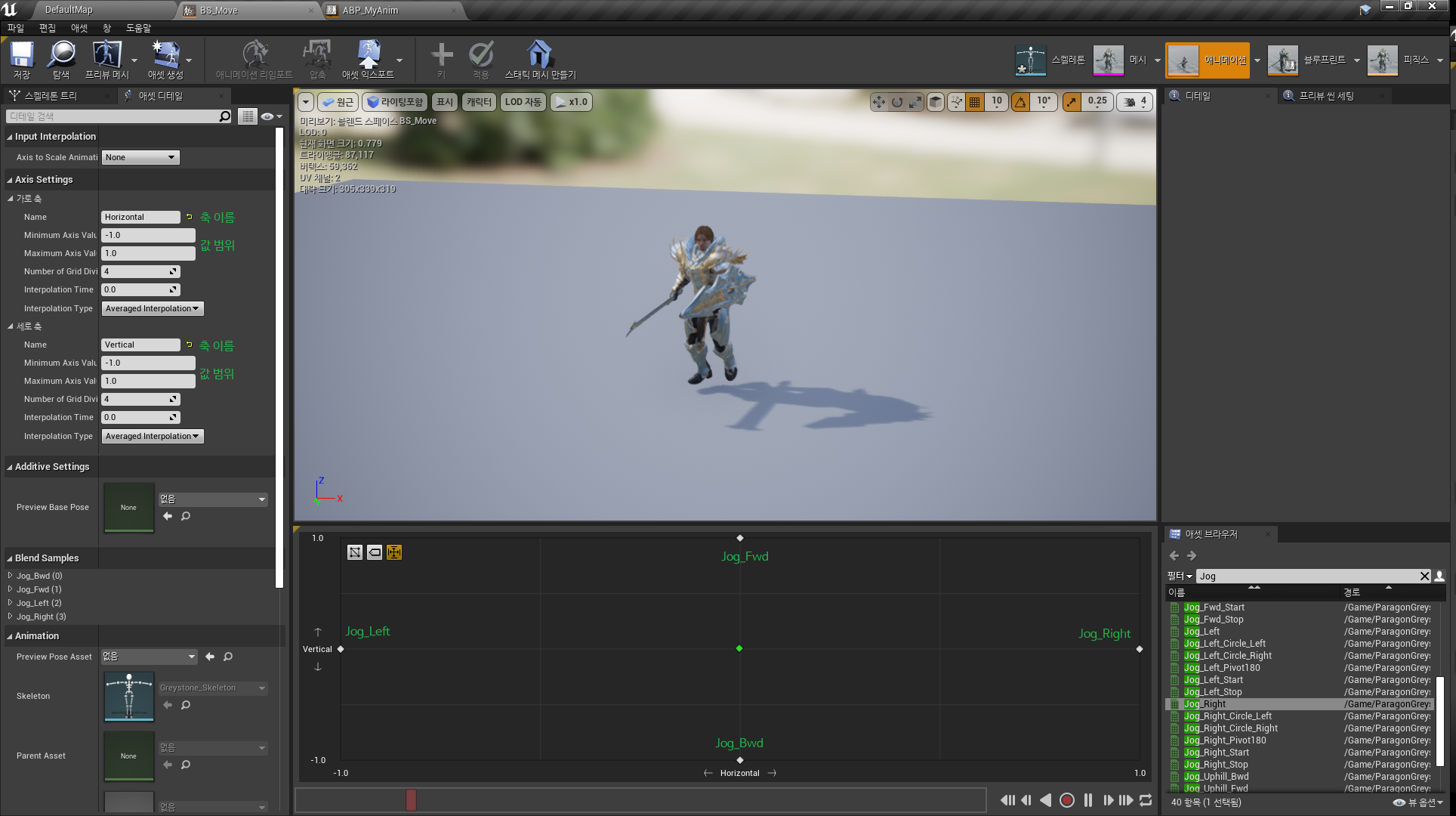 블렌드 스페이스, 코드 추가, 스테이트 수정까지 완료하고 나면 이동 애니메이션이 방향에 따라 적절하게 섞인것을 볼 수 있다.