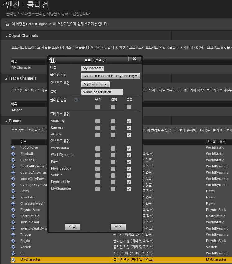 프로젝트 세팅 - 콜리전에서 오브젝트 채널, 트레이스 채널 및 프리셋을 지정해 줄 수 있다