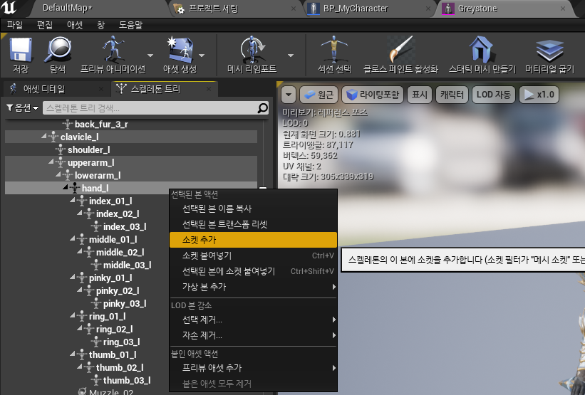 스켈레톤 트리에서 왼손에 소켓을 추가해준다.