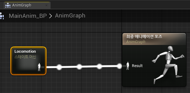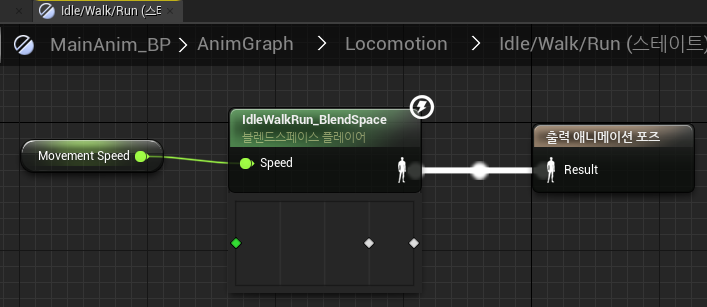 애셋 브라우저에서 기존에 만들었던 블렌드 스페이스 1D를 가져와서 출력 애니메이션 포즈에 연결시키고 MovementSpeed를 매개변수로 넘겨준다.