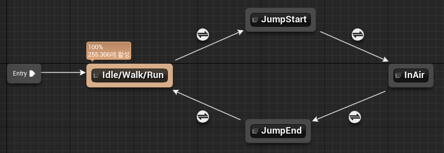 JumpStart에는 Jumping_Up, InAir에는 Falling_Idle, JumpEnd에는 Jumping_Down 애니메이션을 연결시켜준다.
