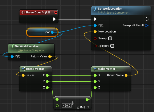 기능이 직관적이다. Door(StaticMeshComponent)의 월드 좌표를 받아와서 x, y, z 세 성분으로 쪼갠 후 z축만 450 더한 후 다시 벡터로 조립해 해당 벡터값으로 월드 좌표를 설정하는 것이다.