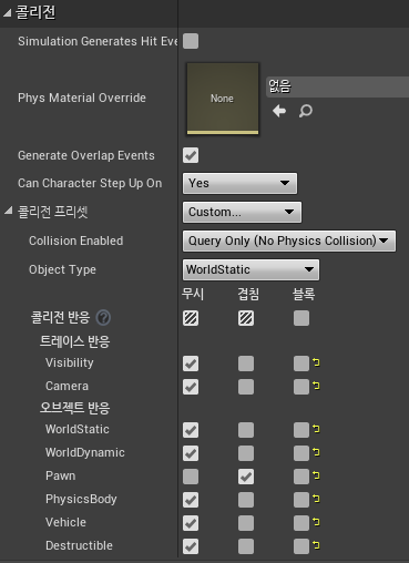 NoCollision은 충돌처리X, PhysicsOnly는 물리만 적용, QuetyAndPhysics는 물리와 쿼리(Overlap시 콜백호출) 둘다, QueryOnly는 물리는 무시하지만 쿼리만 처리한다.