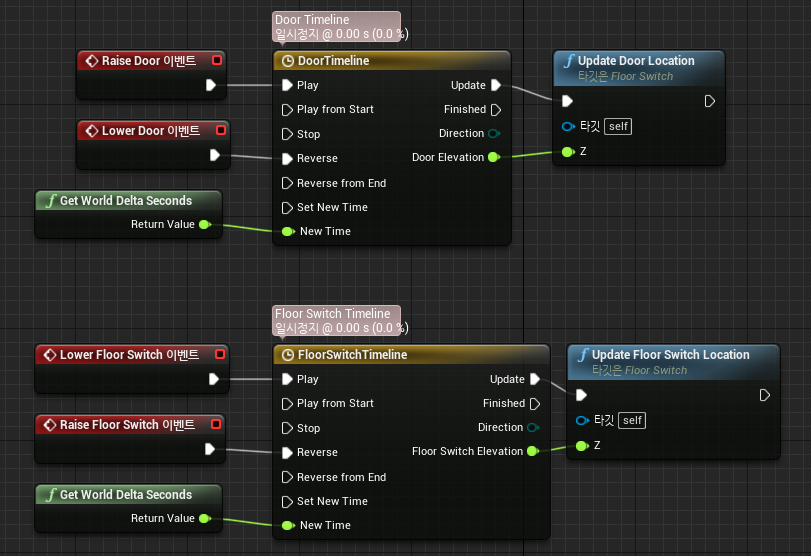 OnOverlap이 발생하면 타임라인으로 만들어준 보간값이 UpdateDoorLocation에 전달되어서 Z축으로 부드럽게 이동하게 된다.