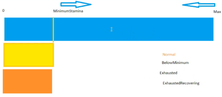 스태미너가 최소치를 초과한 상태, 최소치 이하인 상태, 0인 상태, 0에서 회복중인 상태 4개로 구분한다.