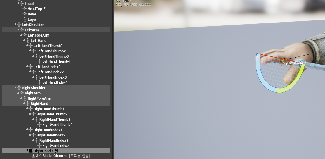 스켈레톤에서 RightHand에 소켓을 추가하고 무기 하나를 프리뷰 해서 위치를 적절히 조절한다.