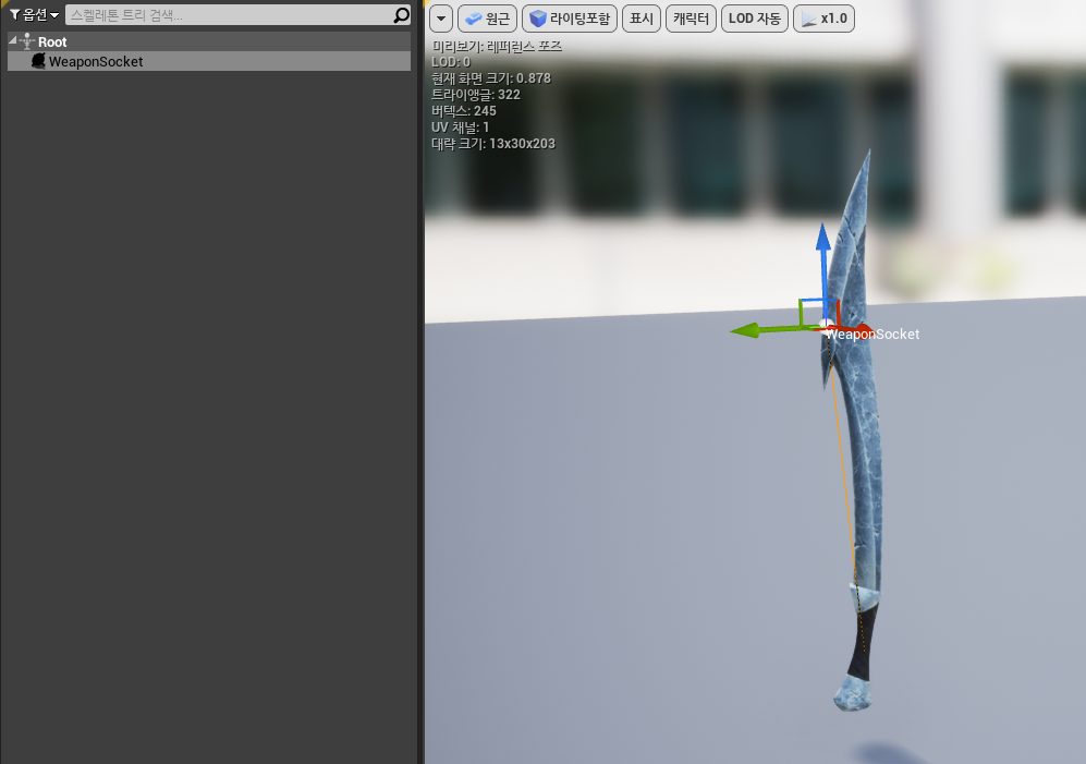 무기의 스켈레탈 메시에서 소켓을 추가하고 파티클이 재생되길 원하는 위치로 조절한다.