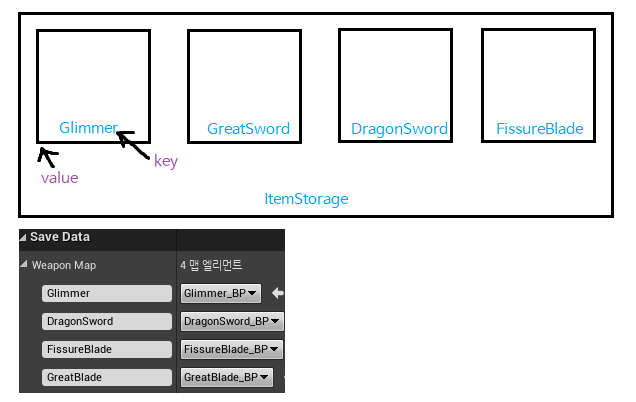ItemStorage가 4개의 무기 블루프린트를 가지고 Save/Load할 때 ItemStorage에 접근해서 저장할 때 장착하고 있던 무기의 이름과 ItemStorage의 이름과 비교해서 같은 것을 SpawnActor로 월드에 스폰시키고 캐릭터에 장착시켜주는 매커니즘으로 작동한다.
