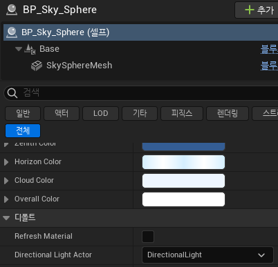 Sky Sphere와 Directional Light를 연동시켜서 하늘에 태양을 띄울 수 있다. Directional Light를 회전시킨 후 Refresh Material을 누르면 태양의 위치가 바뀐다.