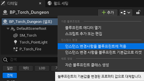 아웃라이너에서 변경한 값들을 블루프린트에 일괄적용 시킬 수 있다.