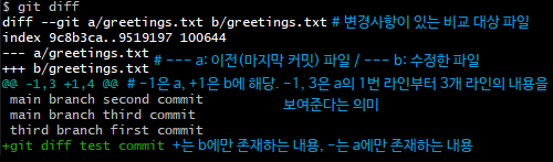 -, +를 b에 비교해서 없는 내용, 있는 내용으로 구분지어서 생각하기 보다는 -는 a에만 있는 내용, +는 b에만 있는 내용이라고 생각하는게 이해하기 조금 더 쉽다.