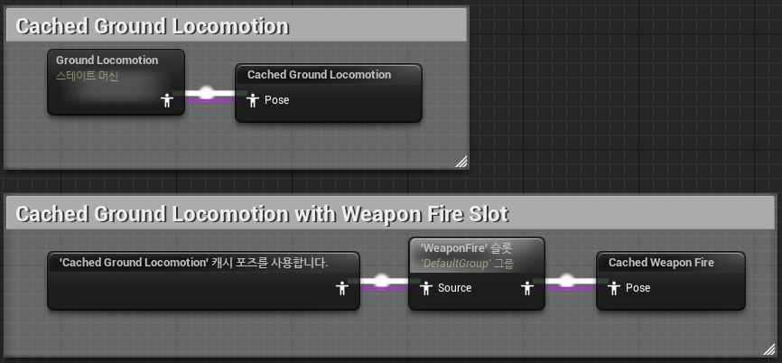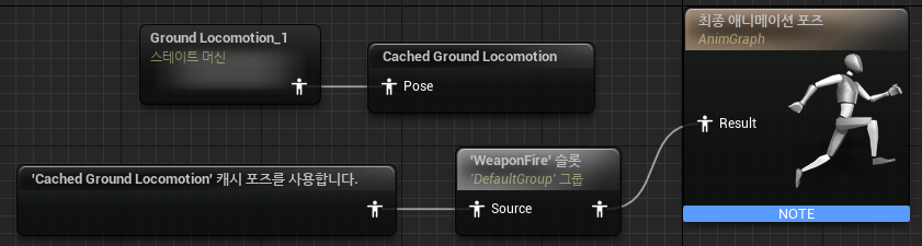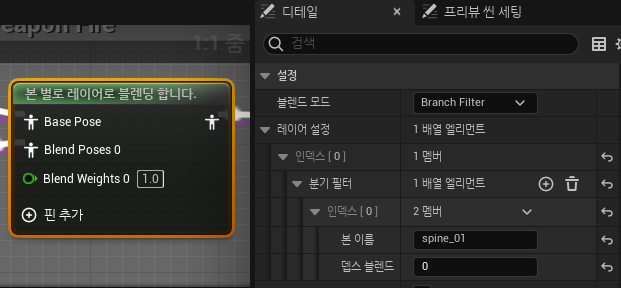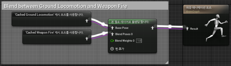 기본은 이동이 되므로 베이스 포즈로 이동 애니메이션 캐시포즈를 지정하고 블렌드 포즈로 사격 캐시포즈를 지정한다.