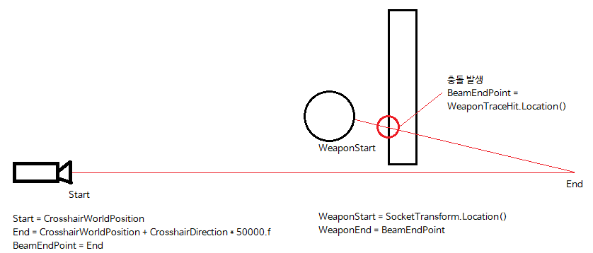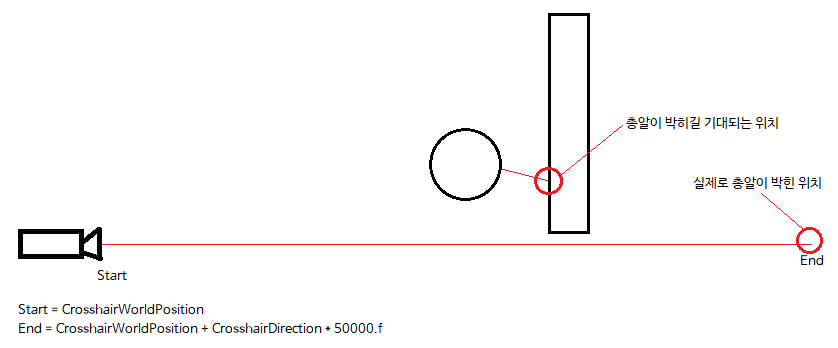 이 때문에 레이캐스트를 한 번만 사용한다면 총알의 타격 이펙트가 의도하지 위치에 생성되므로 두 번의 레이캐스트를 통해 값을 보정하여 사용해야 한다.