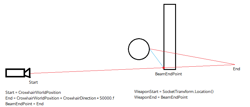 첫 레이캐스트로 에임과 오브젝트의 충돌 여부를 판단해서 끝점을 조정하고 두번째 레이캐스트로 실제 착탄 위치를 판별한다.