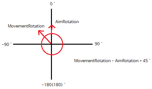 AimRotation은 월드 좌표에 상대적이고 MovementRotation은 AimRotation에 상대적이기 때문에 두 값의 차이는 캐릭터의 회전과 관계없이 언제나 일정하게 나온다. 다만 속도가 0이라면 AimRotation을 빼고있기 때문에 마우스의 회전만으로도 각이 변하게 된다.