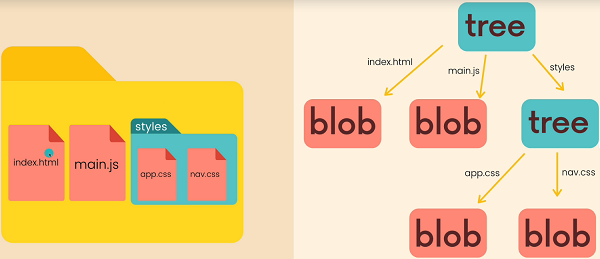 디렉토리 내용을 저장한다. 블롭을 가리키는 포인터와 트리를 가리키는 포인터 둘 다 가지고 있다.