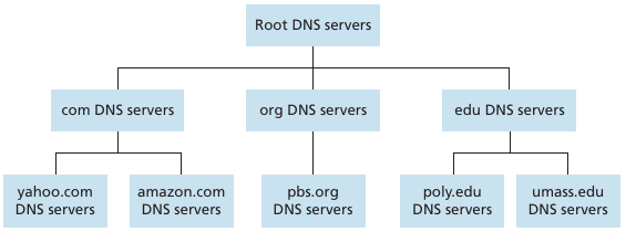 루트 DNS 서버, 최상위 레벨 도메인(TLD) 서버, 책임 DNS 서버 총 3가지 유형의 DNS 서버가 존재한다.
