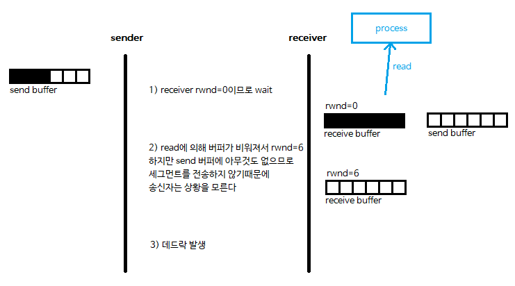 이 때, 송신자가 다시 전송을 시작하려면 수신자는 ACK 피드백을 통해 현재 rwnd 여유가 생겼다는것을 송신자에게 알려주어야 한다. 하지만 수신자의 send 버퍼까지 비어있다면 데드락이 발생하게 된다.