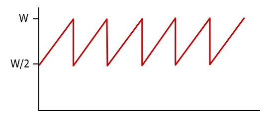 이 때 패킷은 용량 R의 공유 출력 링크로 전달되고 연결당 처리량은 최대 R/2까지 증가한다.