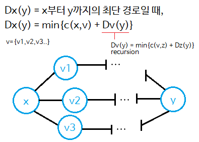 동적 계획법에 의해 구해지지만 모든 경로를 미리 알고있는 상태가 아니므로 인접 노드들과 메시지를 주고 받으며 자신의 거리 벡터를 갱신하여 라우팅 테이블을 작성해나간다.