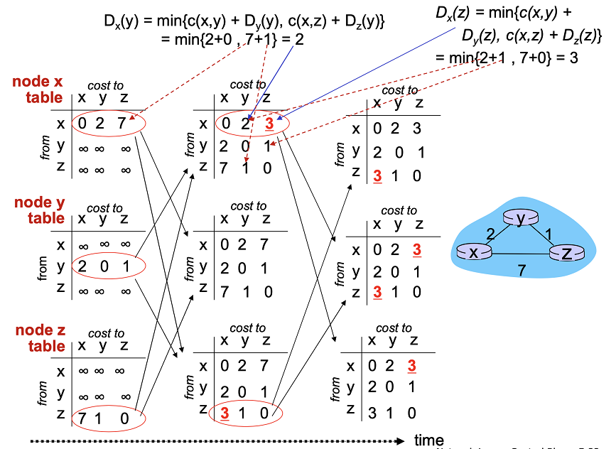 위의 그림에서 z-x의 경로는 초기에 7이었으나 거리 벡터 알고리즘에 의해 최종적으로 y를 경유하는 3으로 갱신된다.