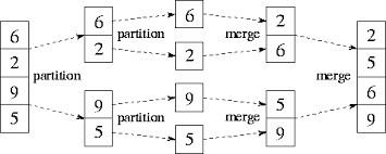 배열을 충분히 작은 크기까지 반으로 계속 쪼개고 합치는 과정에서 정렬을 수행한다.