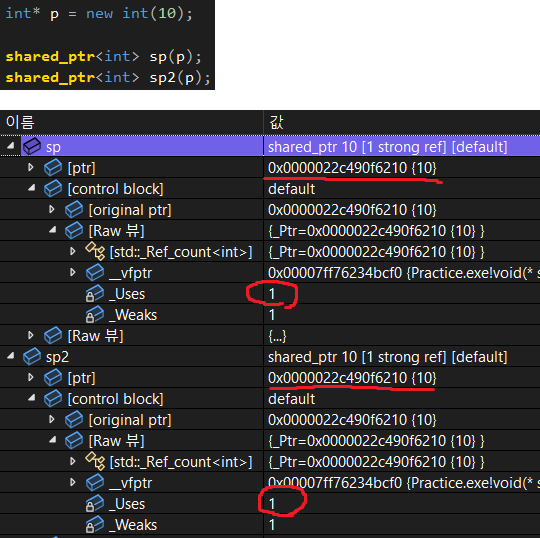 weak_ptr는 shared_ptr과 크기가 같고 shared_ptr가 사용하는 제어 블록과 같은 제어 블록에 접근하여 사용한다.