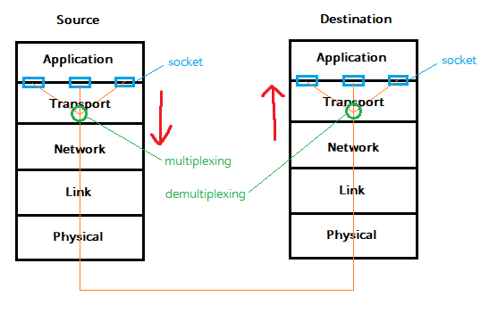 다중화 : 세그먼트들을 네트워크 계층으로 전달하는 작업. 애플리케이션 계층에서 트랜스포트 계층으로 소켓을 통해 메시지가 전달될 때, 하나의 세그먼트로 캡슐화 하여 네트워크 계층으로 전달하는 과정이다.