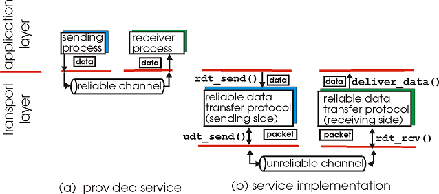 ◾ 완벽하게 신뢰적인 채널 상에서의 데이터 전송: rdt1.0 (reliable data transfer) 하위 채널이 완전히 신뢰적이라고 가정한다. 이 경우에는 각 레이어가 송수신을 바로 진행시키면 된다. 완전히 신뢰적인 채널에서는 수신 측이 송신 측에게 어떠한 피드백도 제공할 필요가 없고 '천천히' 라는것도 요청할 필요가 없다.
