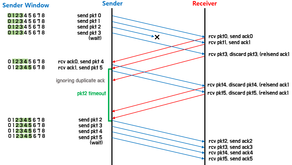 중간에 패킷이 유실되어서 타임아웃이 발생하면 timer가 가리키는 세그먼트가 재전송된다.