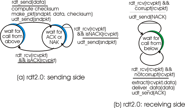 ◾비트 오류가 있는 채널 상에서의 신뢰적 데이터 전송: rdt2.0 패킷 안의 비트들이 하위 채널에서 손상될 수 있지만 송신 순서대로 수신된다고 가정한다. 전화통화의 예를 생각해보면 된다. 상대방의 말을 잘 들었다면 확인 응답을 해준다(수신자 피드백, ACK). 상대방의 말이 잘 안들리면(에러 검출) 다시 말해달라고 요청하고(수신자 피드백, NAK) 상대방은 같은 말을 다시 해준다(재전송). 이 세가지가 자동 재전송 요구(ARQ) 프로토콜에 요구된다.