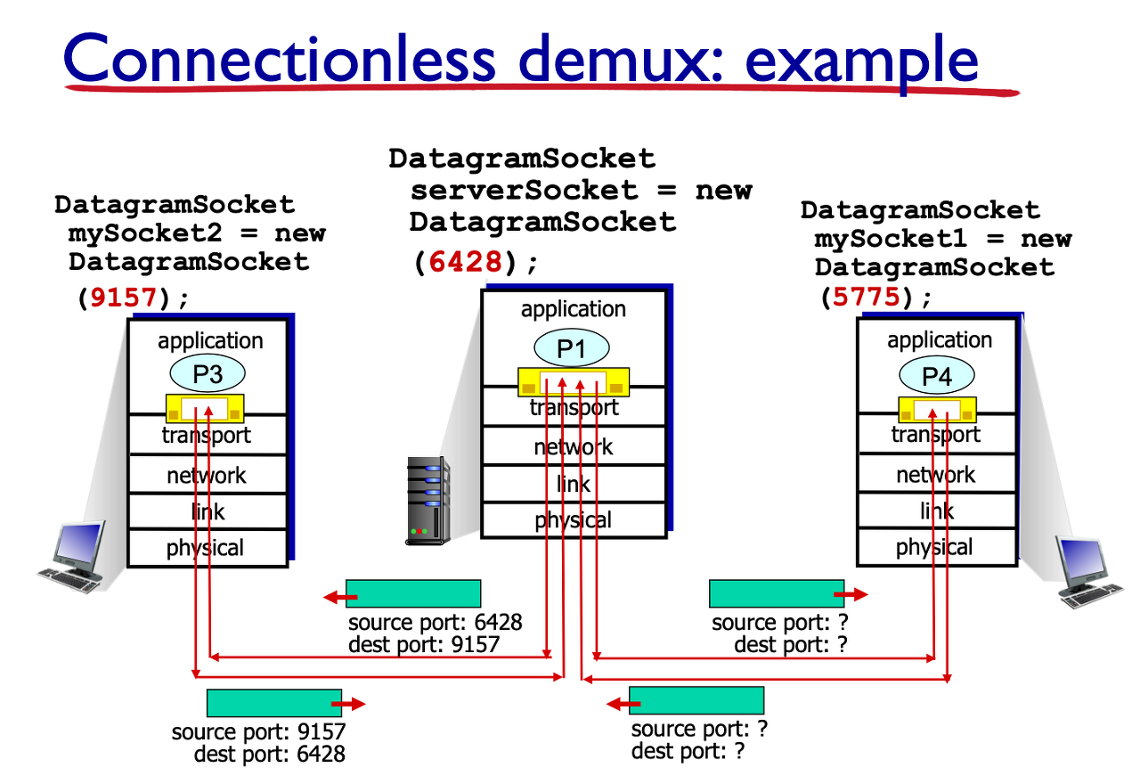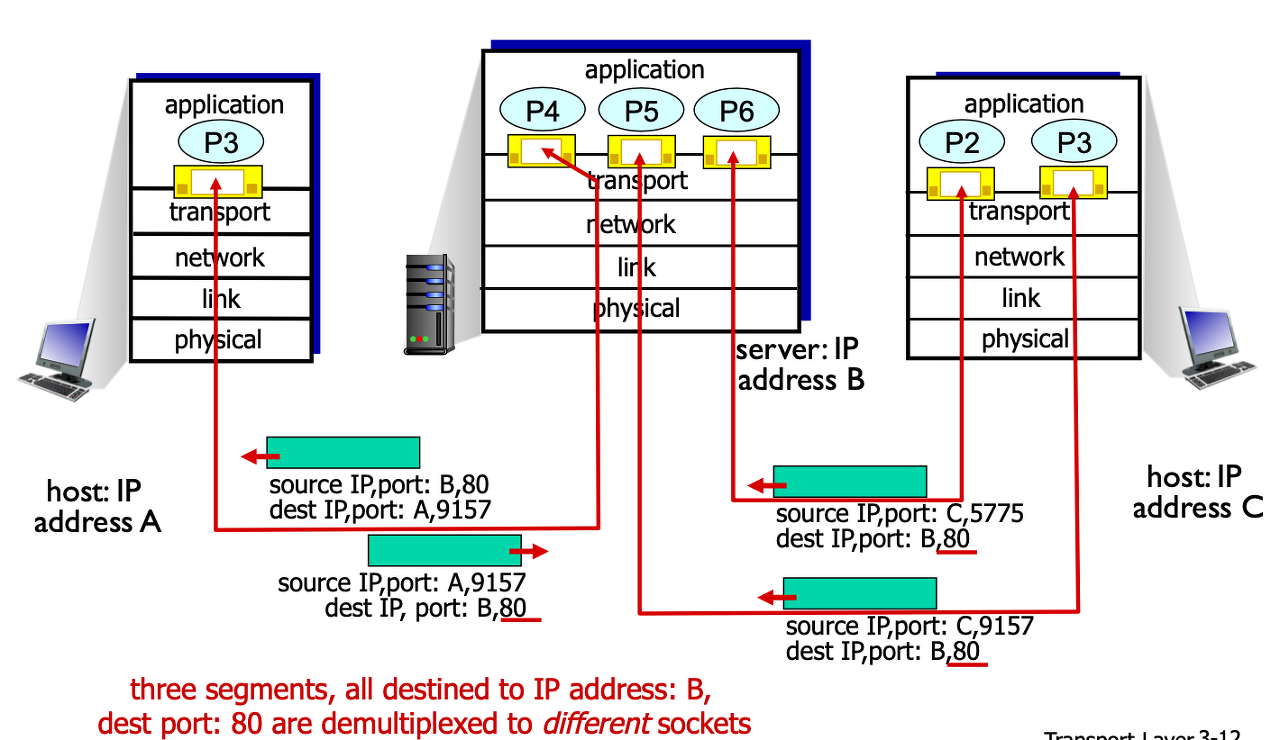 역다중화 : 세그먼트들을 애플리케이션 계층의 올바른 소켓으로 전달하는 작업. 세그먼트의 헤더 정보를 읽어서 올바른 소켓을 판단한다.
