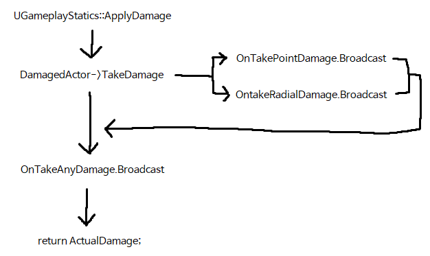 ApplyDamage 호출 시, DamagedActor의 TakeDamage가 호출이 된다.