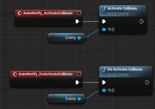무기의 공격력이 25, 기본체력이 75로 되어있으므로 3번만 공격하면 죽는 애니메이션이 재생 될 것이다. 그리고 모든 콜리전을 비활성화 시켰기 때문에 더이상 충돌이 일어나지 않는다.