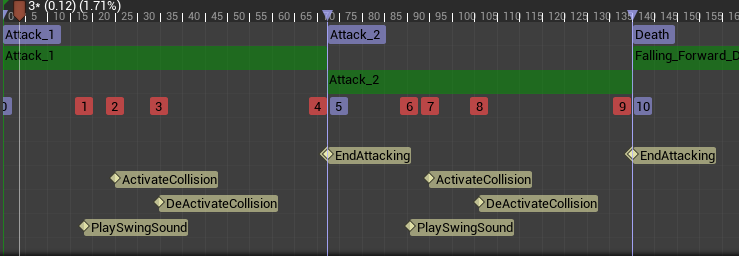 과거에 이미 몽타주에 모션도 추가하고 섹션도 나눠준적이 있다. 거기에 DecreamentHP에서 Die를 실행하기 때문에 내용만 구현 해주면 우선 죽는 애니메이션이 나올 것이다.