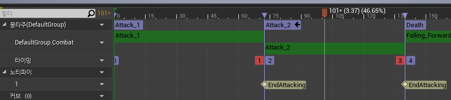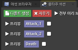 몽타주 섹션에서 이어진 프리뷰까지 끊어주면 공격 모션이 랜덤하게 재생된다.