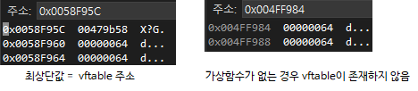 가상 함수가 하나라도 포함된 객체의 경우 메모리에 가상 함수 테이블이 생성되는 것을 확인할 수 있다.