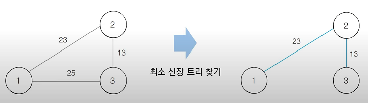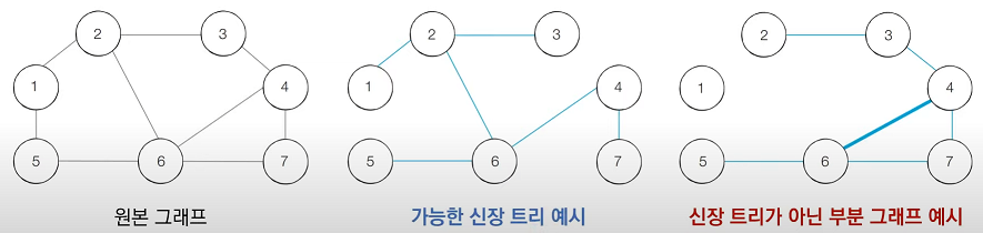 *신장 트리 : 하나의 그래프가 있을 때 모든 노드를 포함하면서 사이클이 존재하지 않는 부분 그래프.